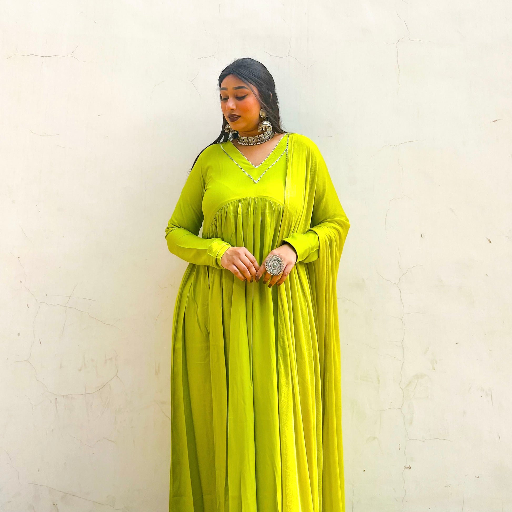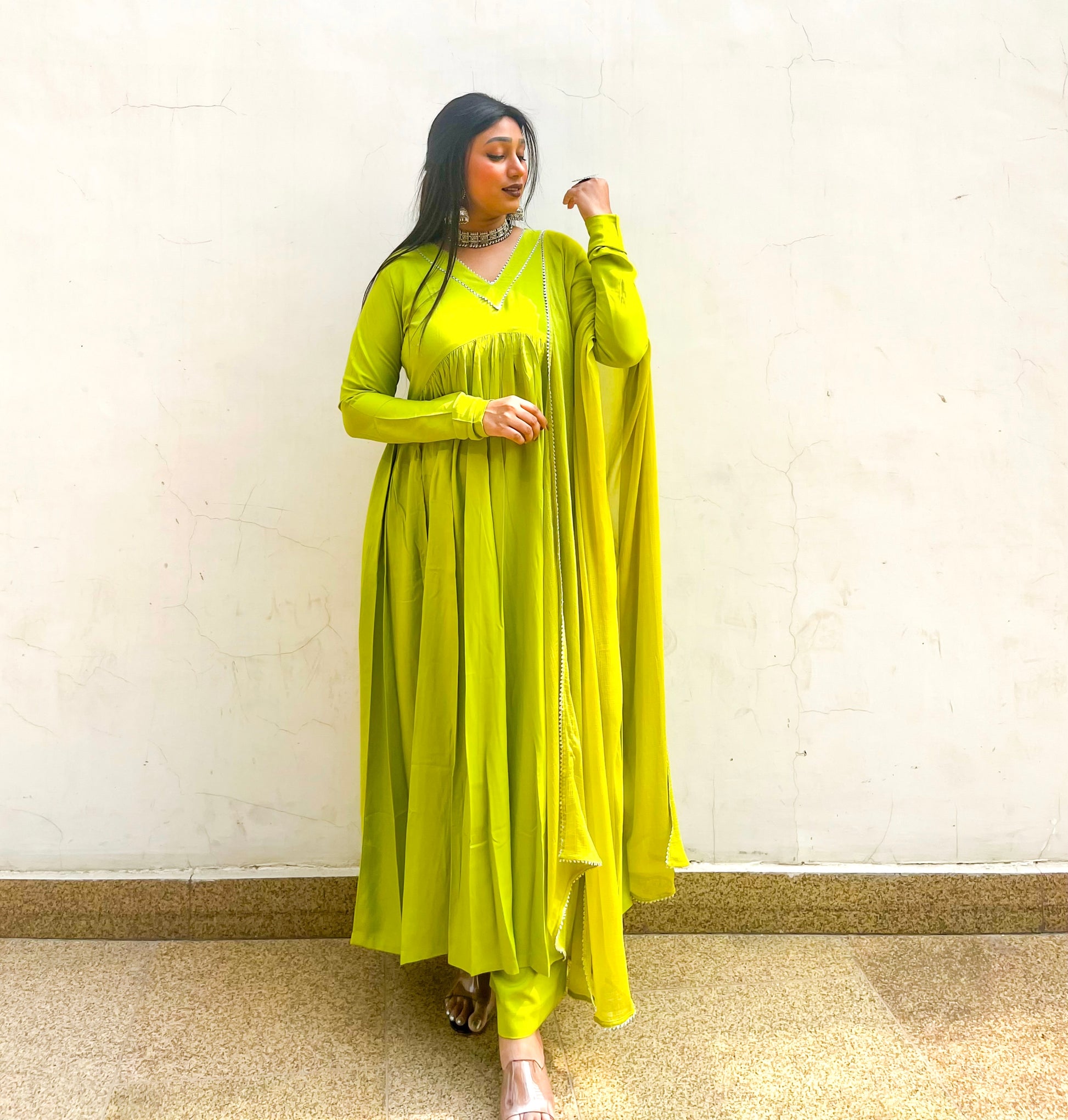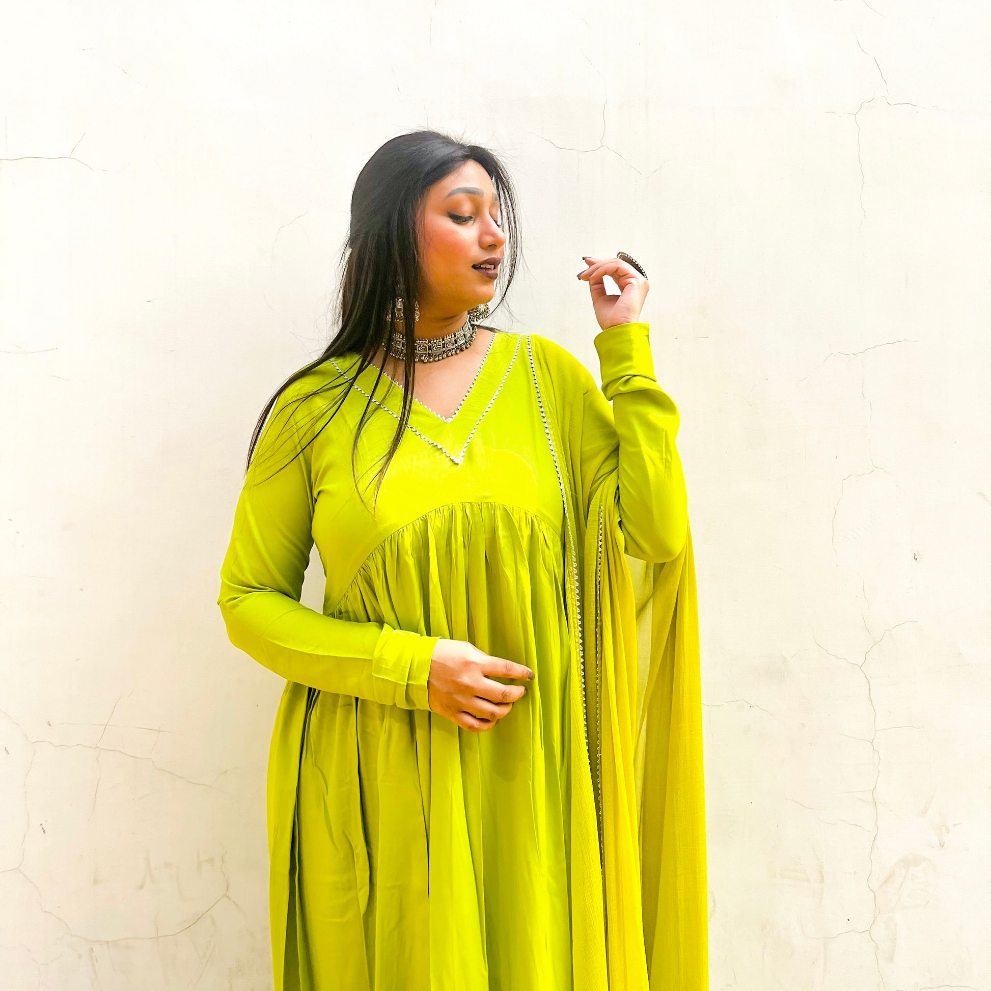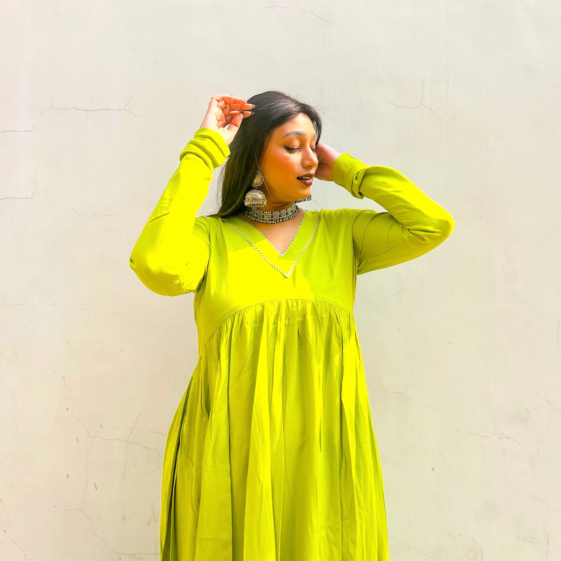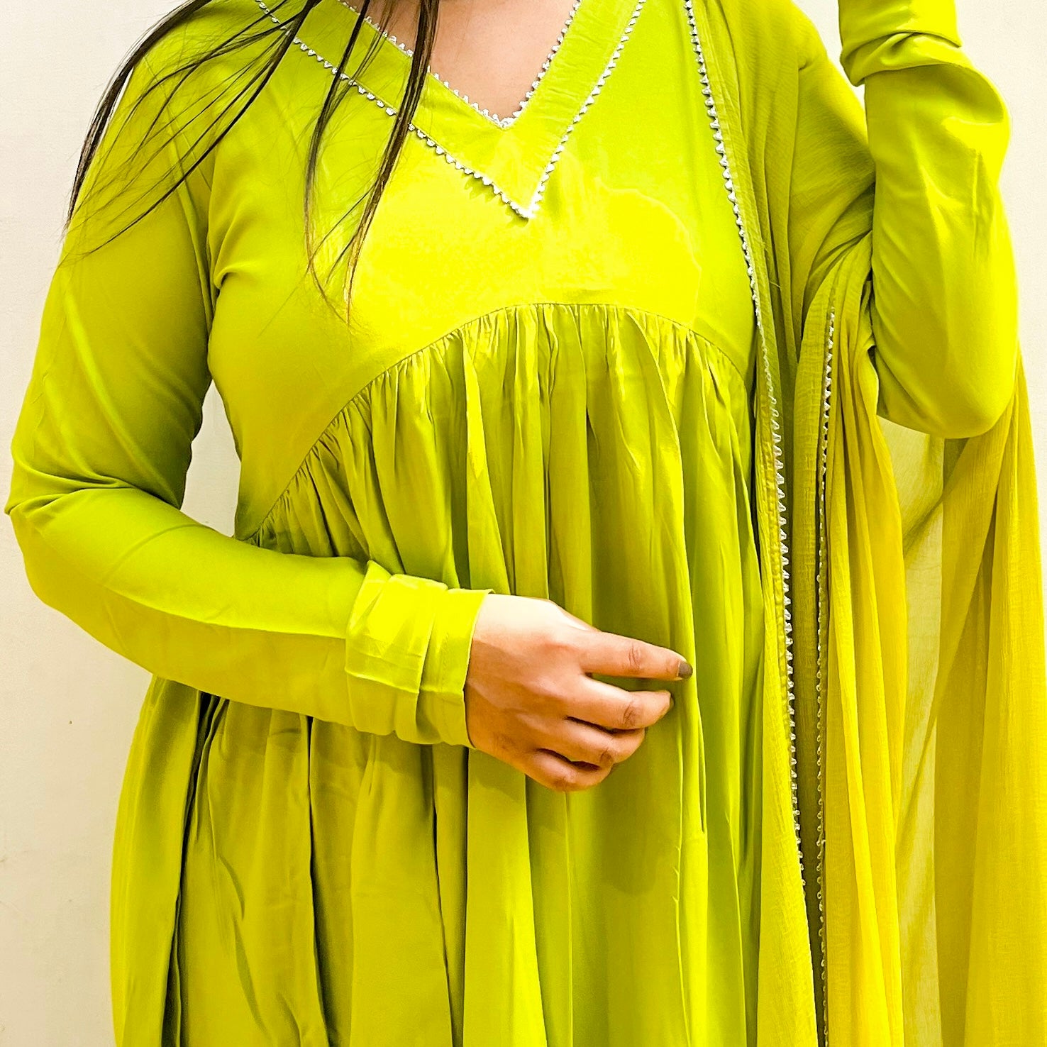 - Experience a taste of modern regality with our lime luminary set that radiates freshness. A testament to timeless artistry, meticulously handcrafted with gold detailing on the neckline and cuffs, creating an enchanting symphony of traditional and contemporary design