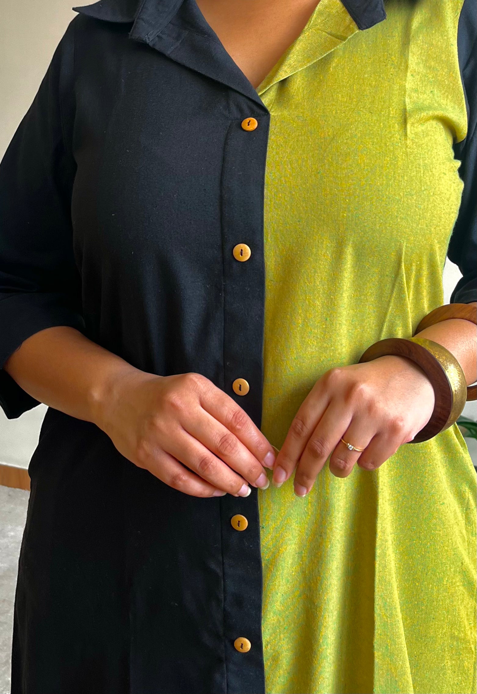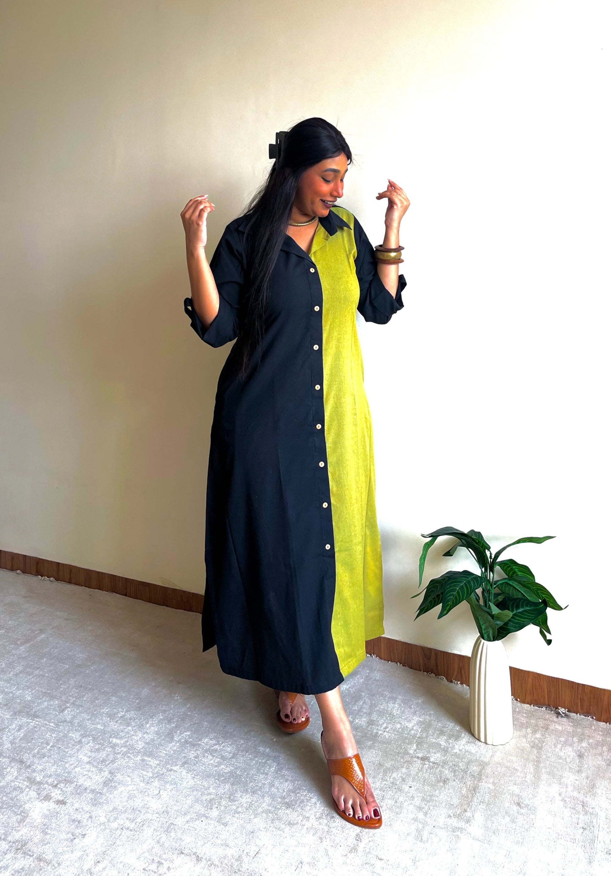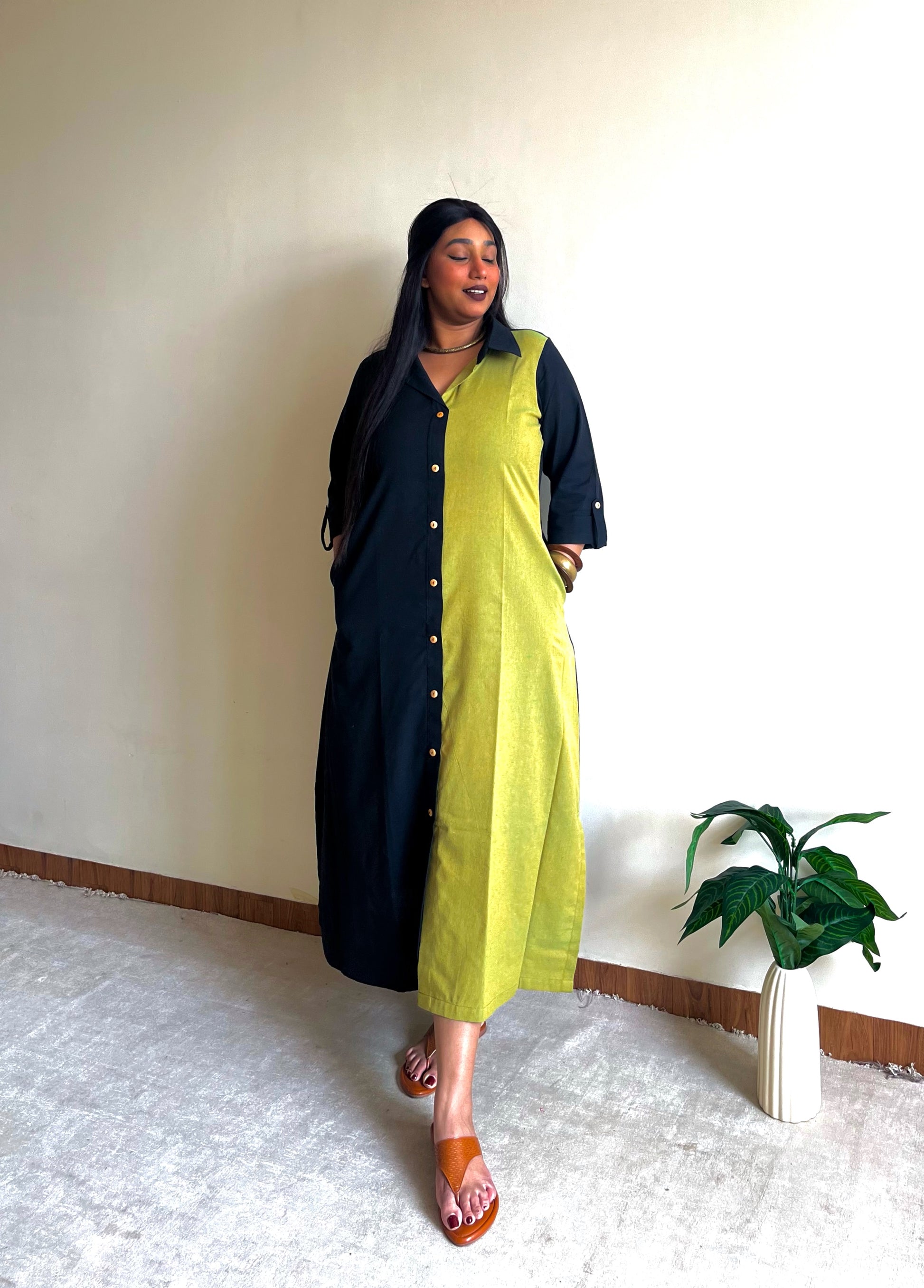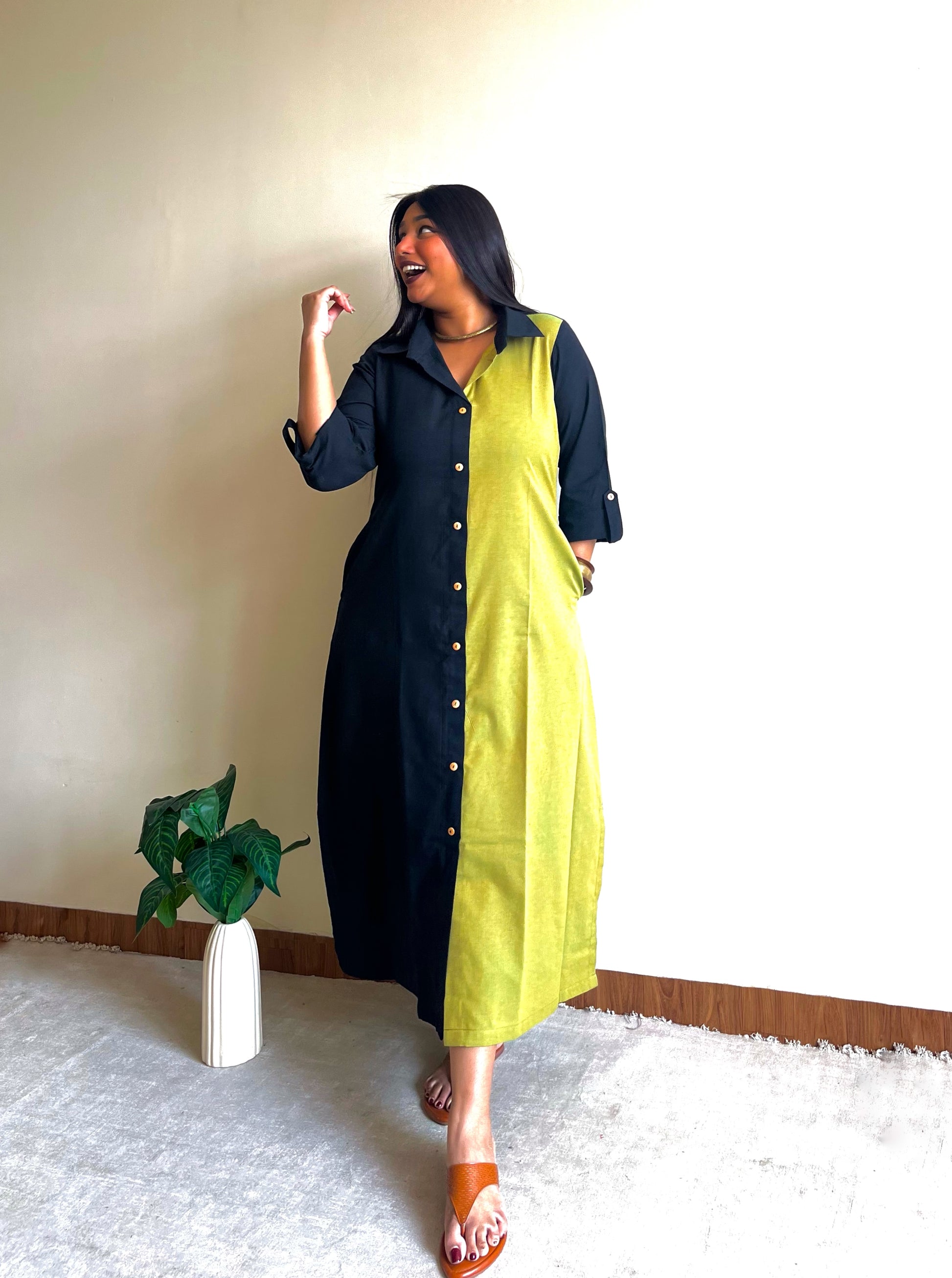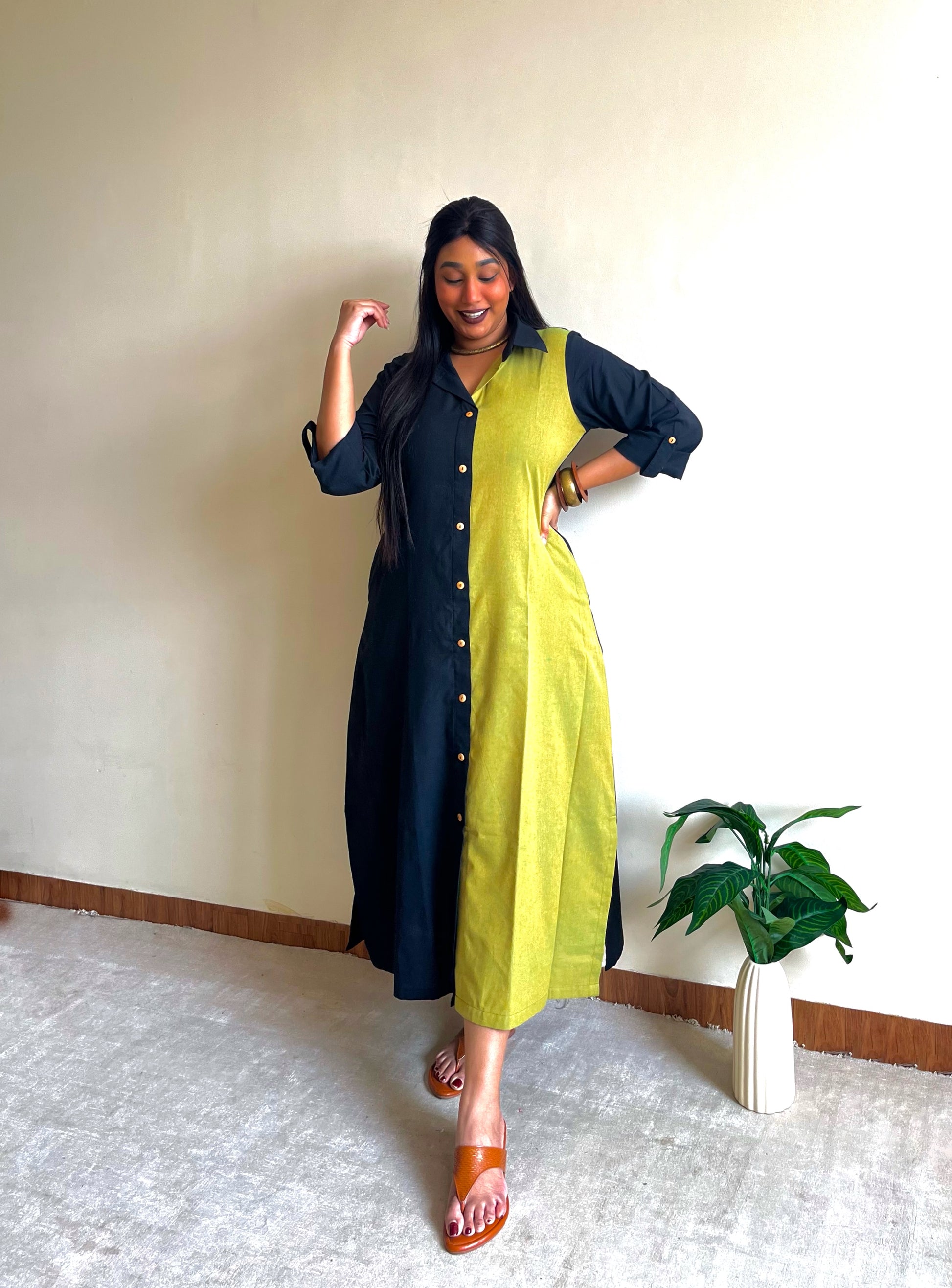 - Featuring a half & half ikkat shirt dress, handcrafted in a blend of earthy tones and modest detailing, for a professional yet stylish look