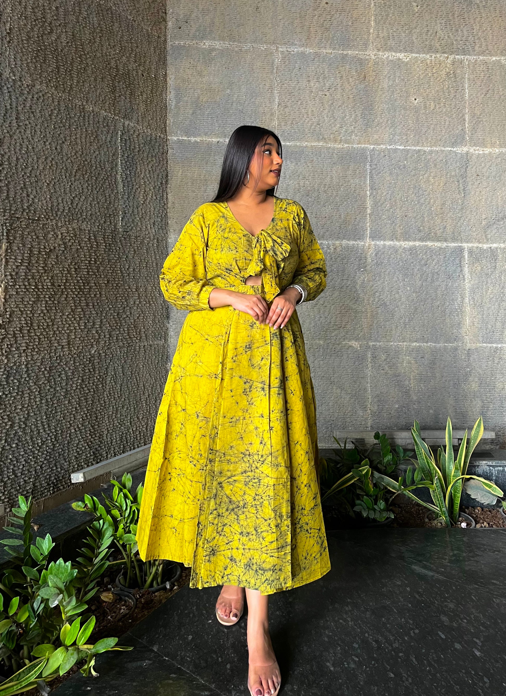 Introducing the Hazel Yellow Knot Dress – a timeless blend of elegance and versatility, perfect for your spring-summer wardrobe. Crafted from pure hand block-printed fabric, this dress is designed to move with you, offering effortless charm and comfort.