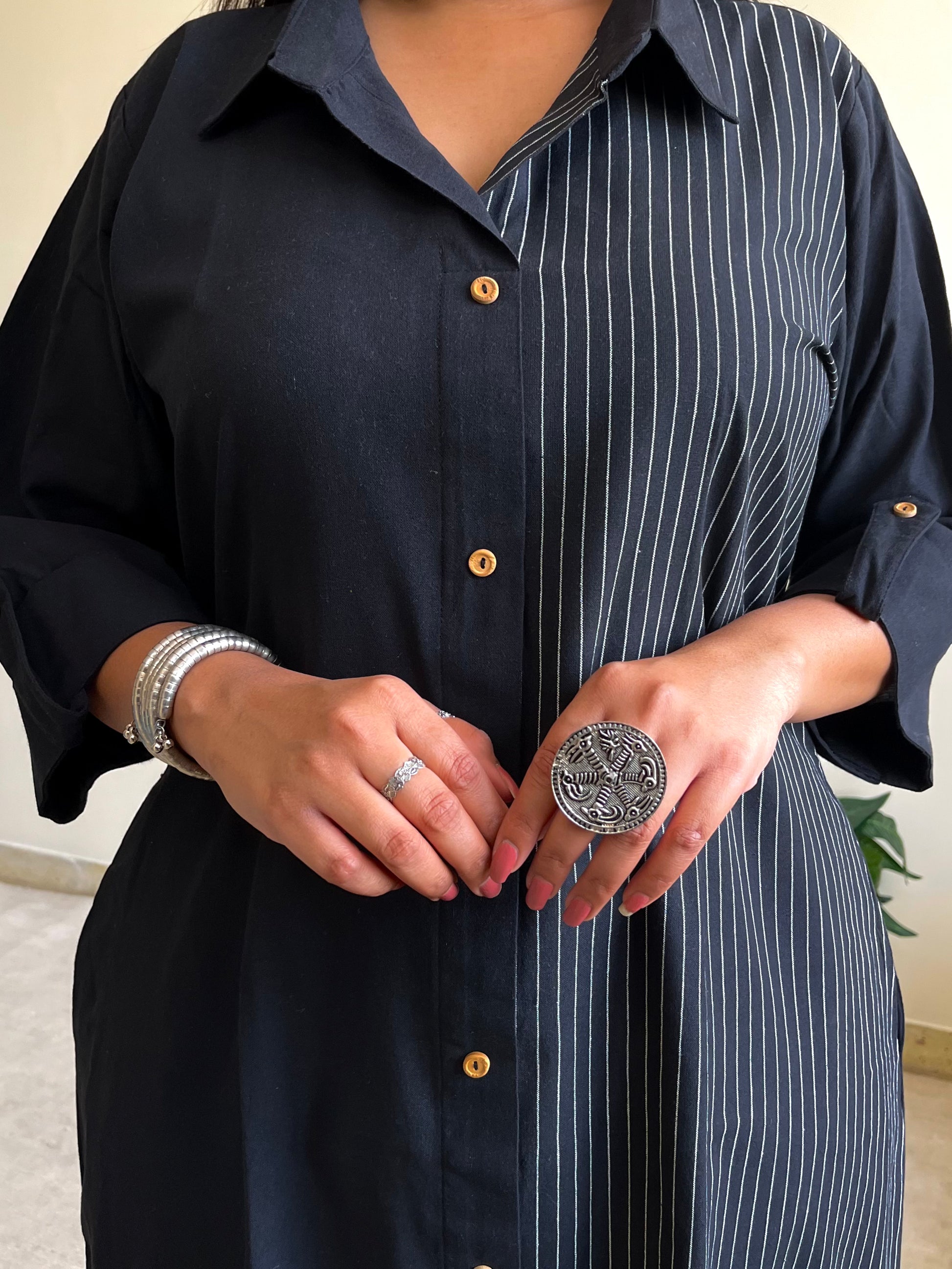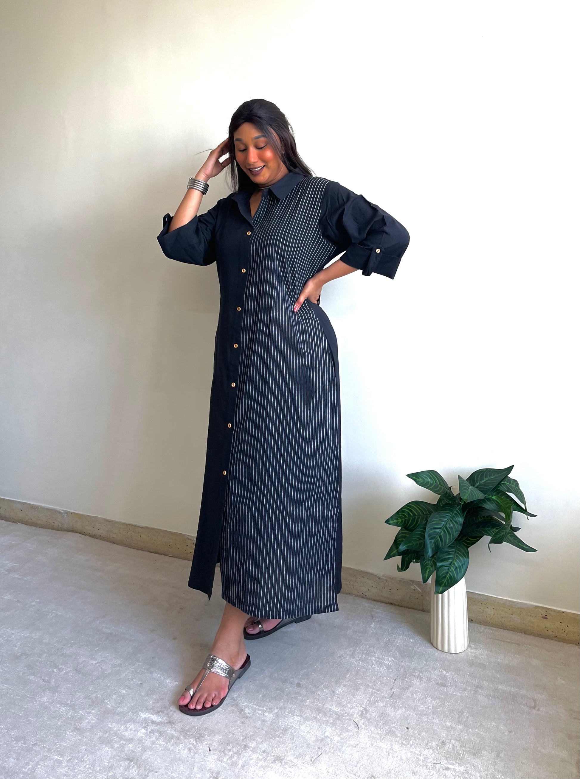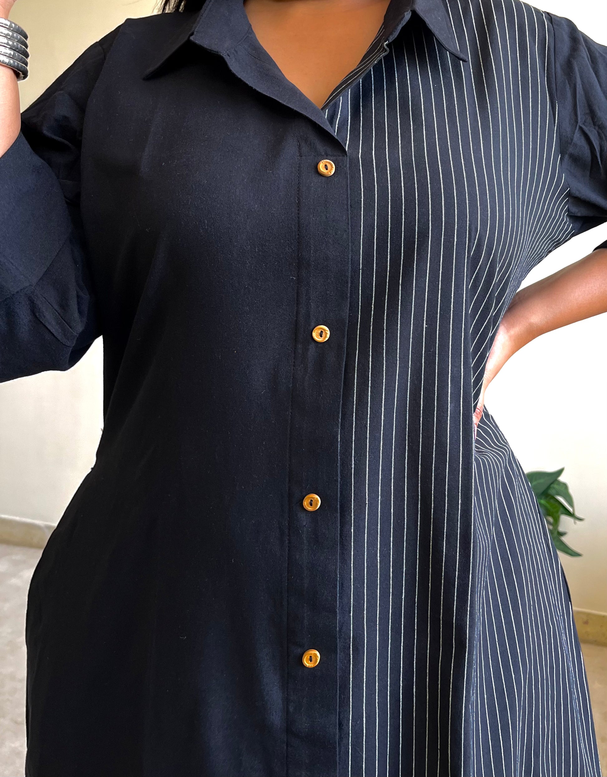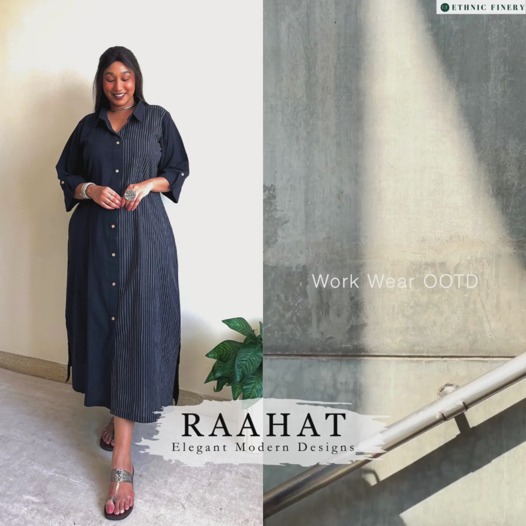 - Featuring a striped half & half ikkat shirt dress, handcrafted in a blend of earthy tones and modest detailing, for a professional yet stylish look
