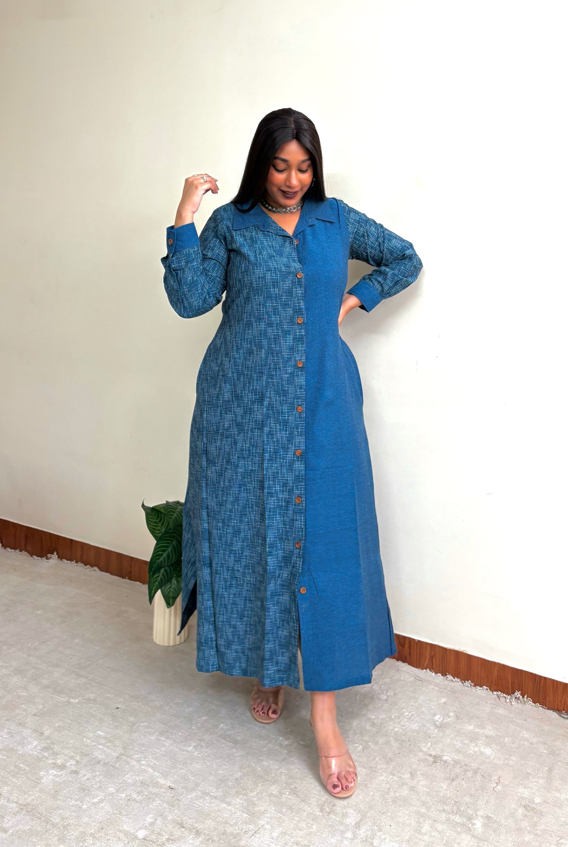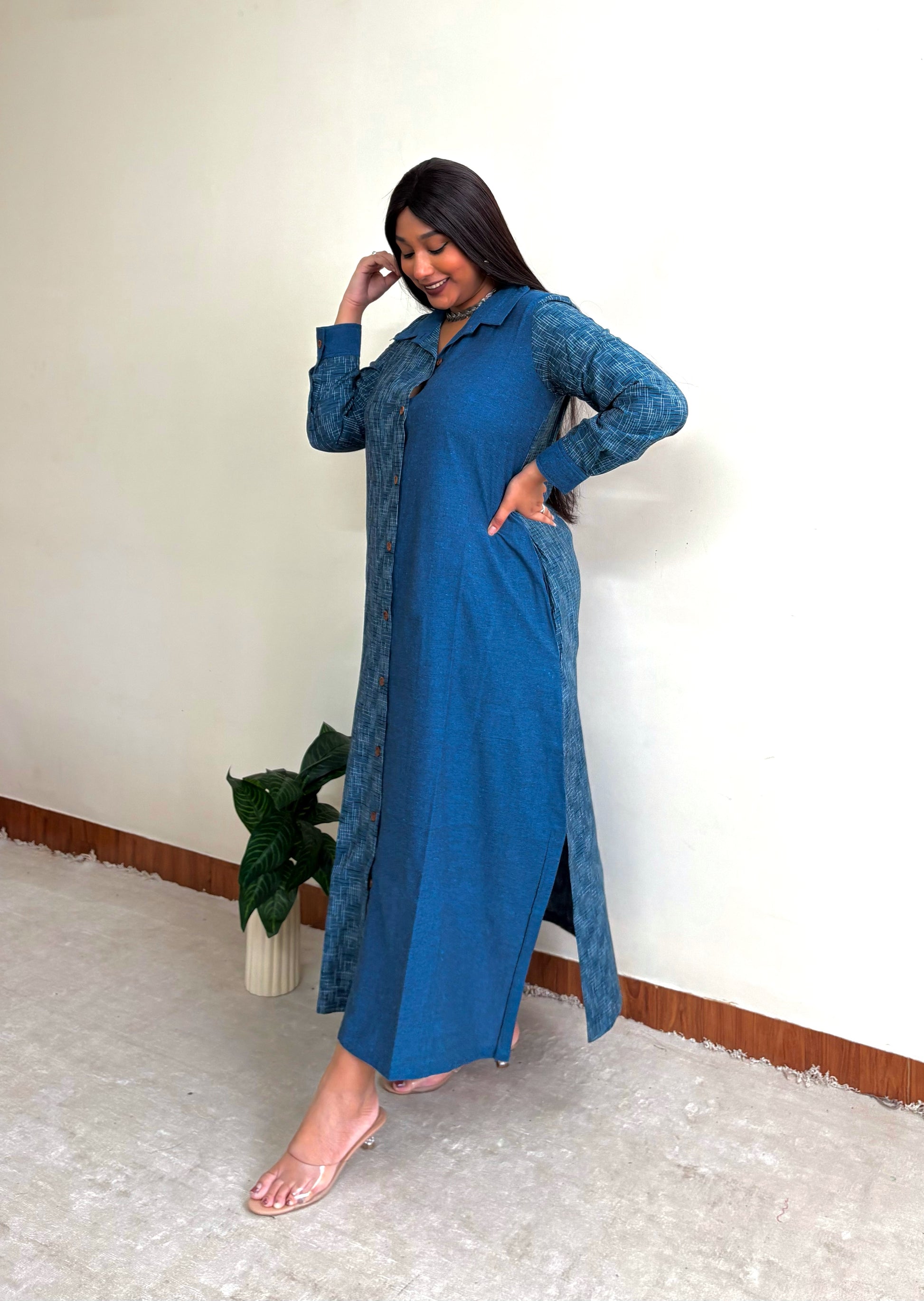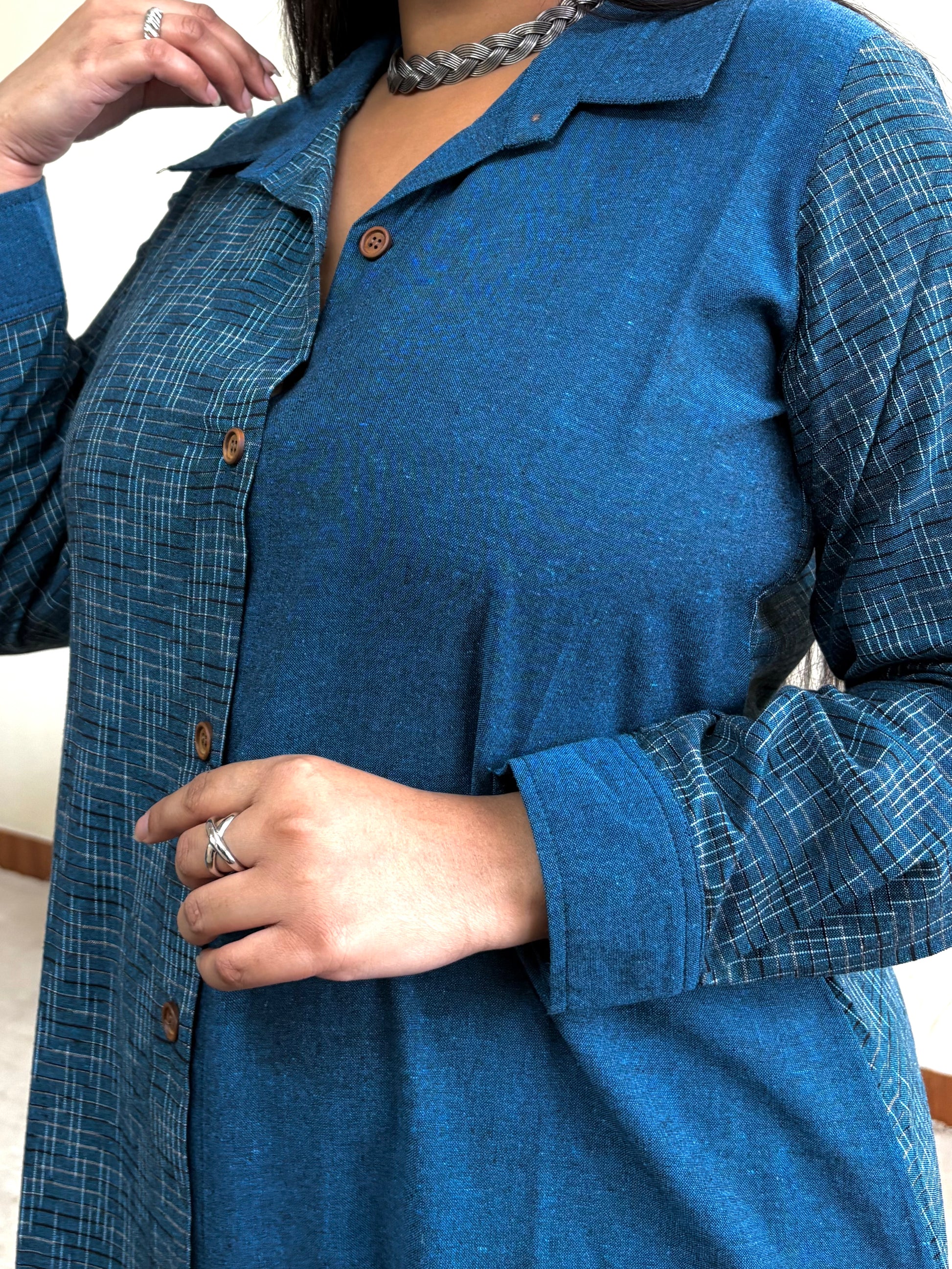 - Handwoven in earthy ikkat tones and finished with handcrafted wooden button detailing, this piece brings together artisanal heritage with contemporary design.
