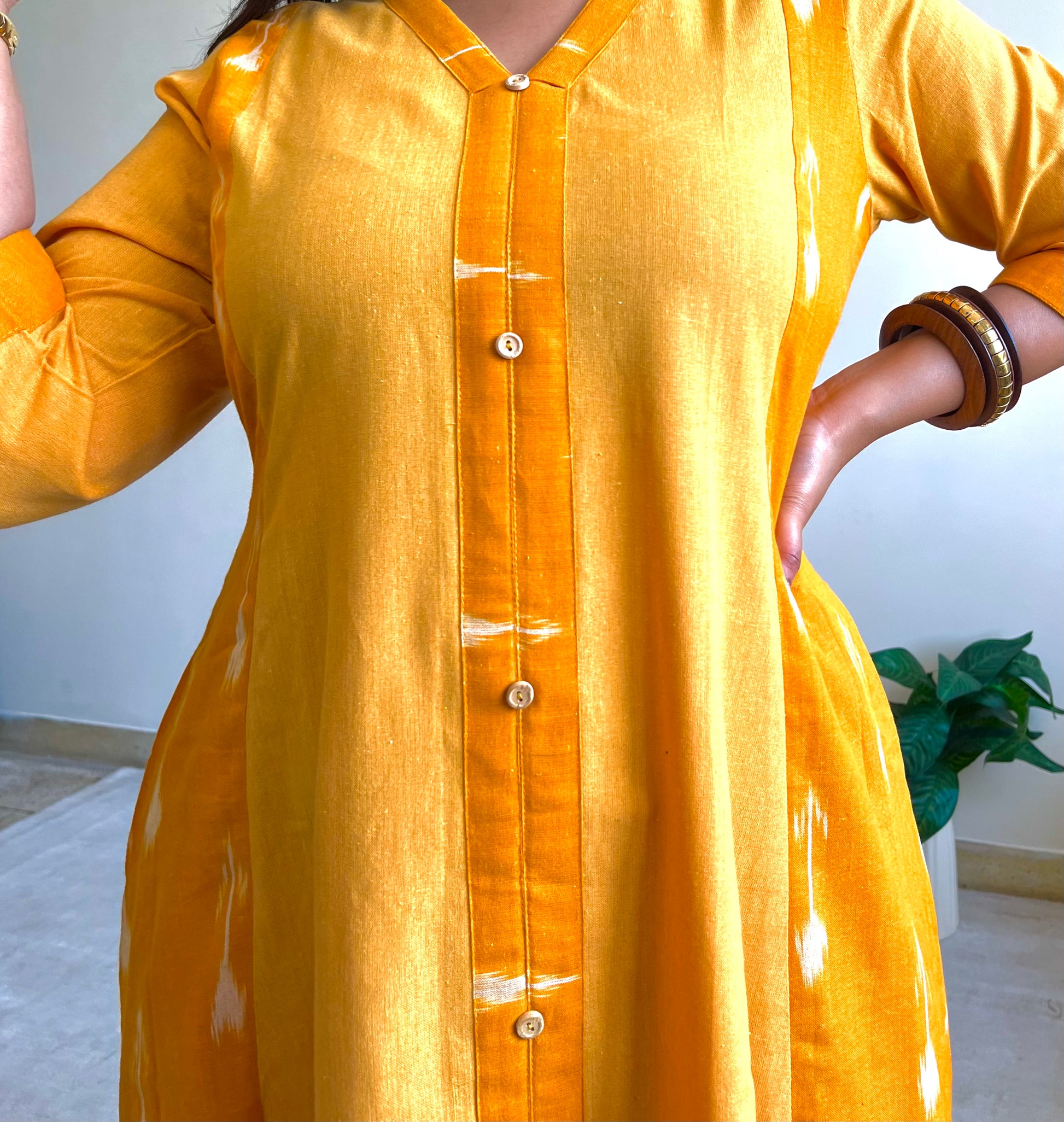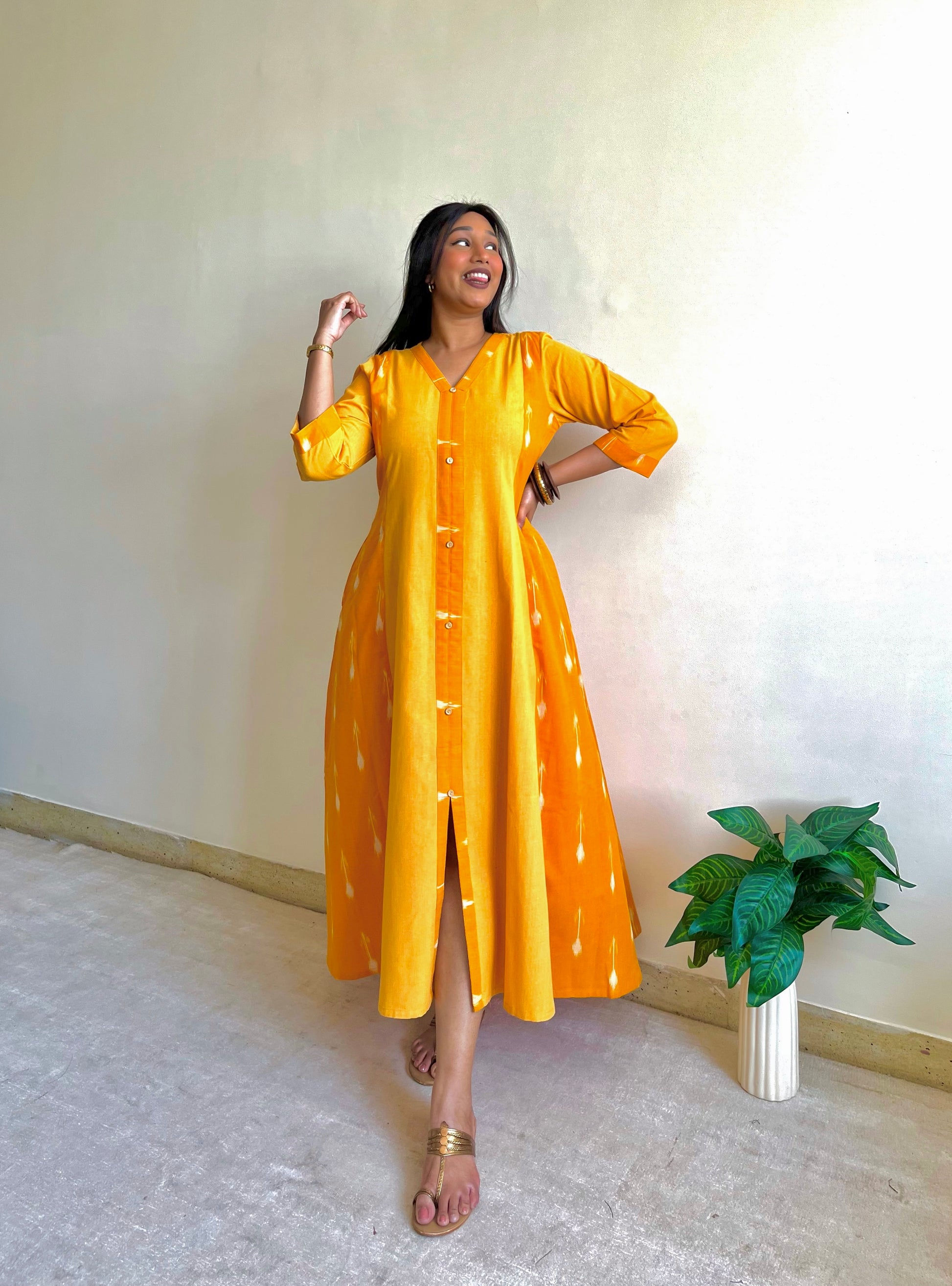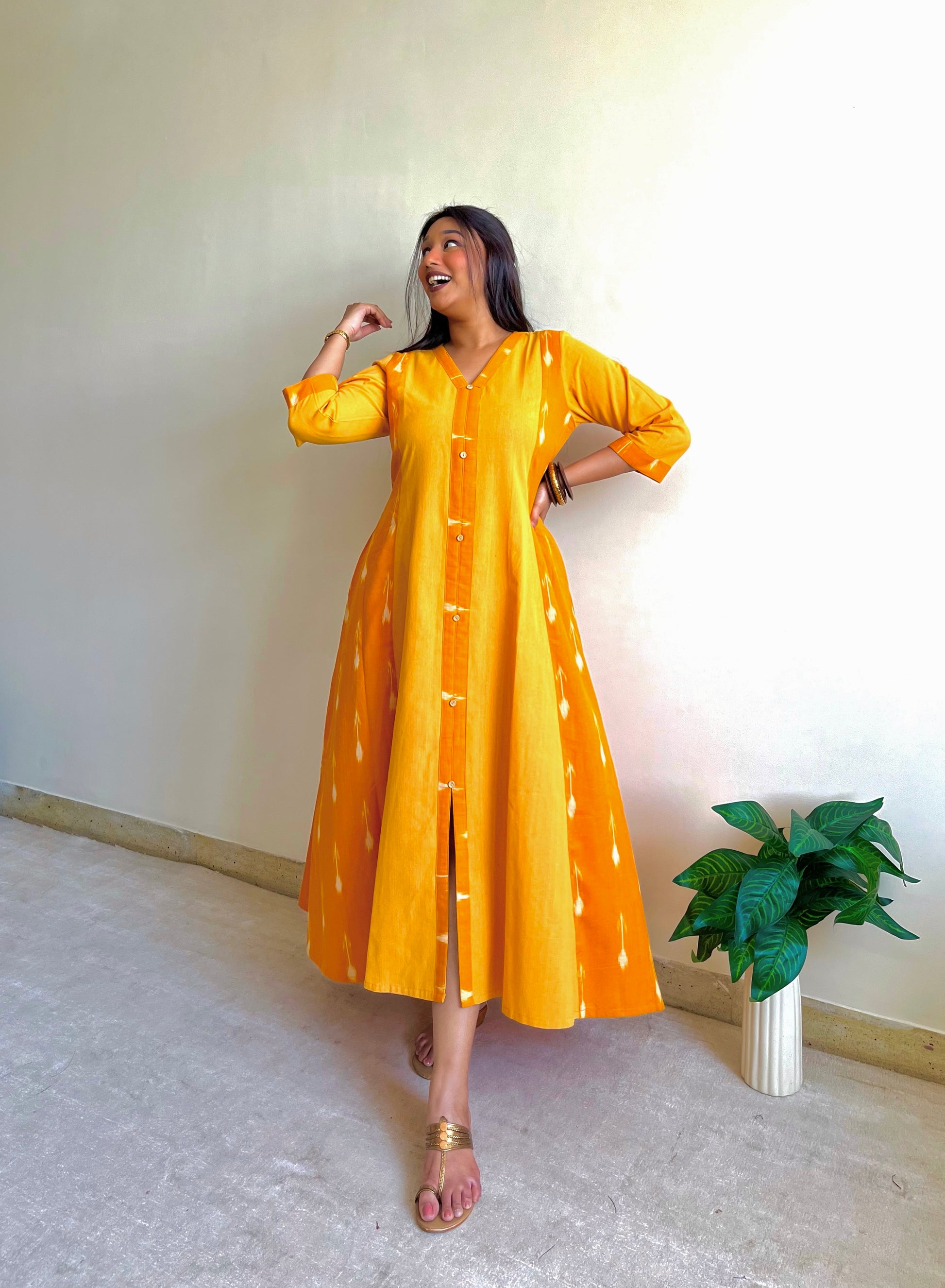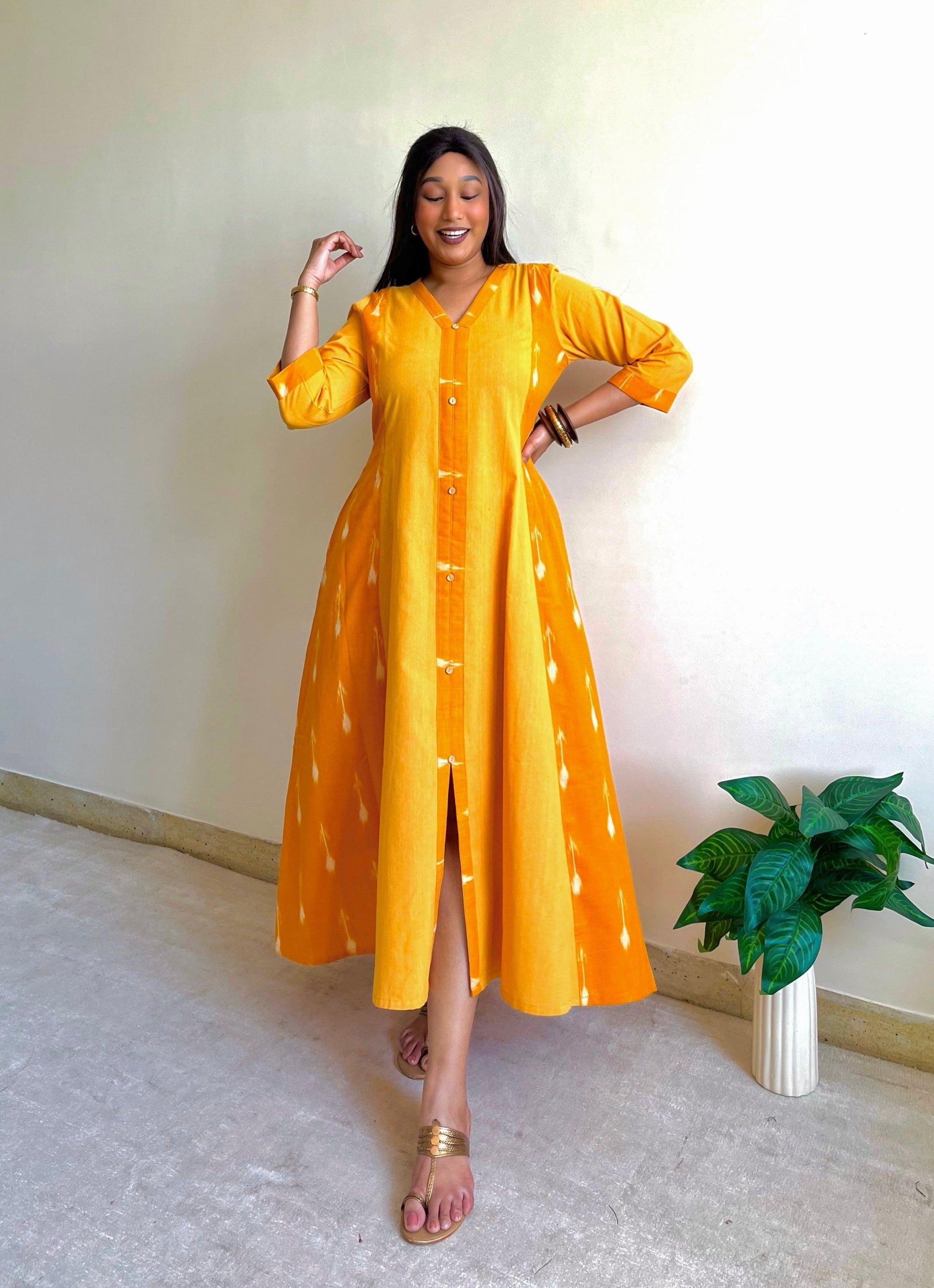 - Featuring an a-line patchwork ikkat shirt dress, handcrafted in a blend of earthy tones and modest detailing, for a professional yet stylish look