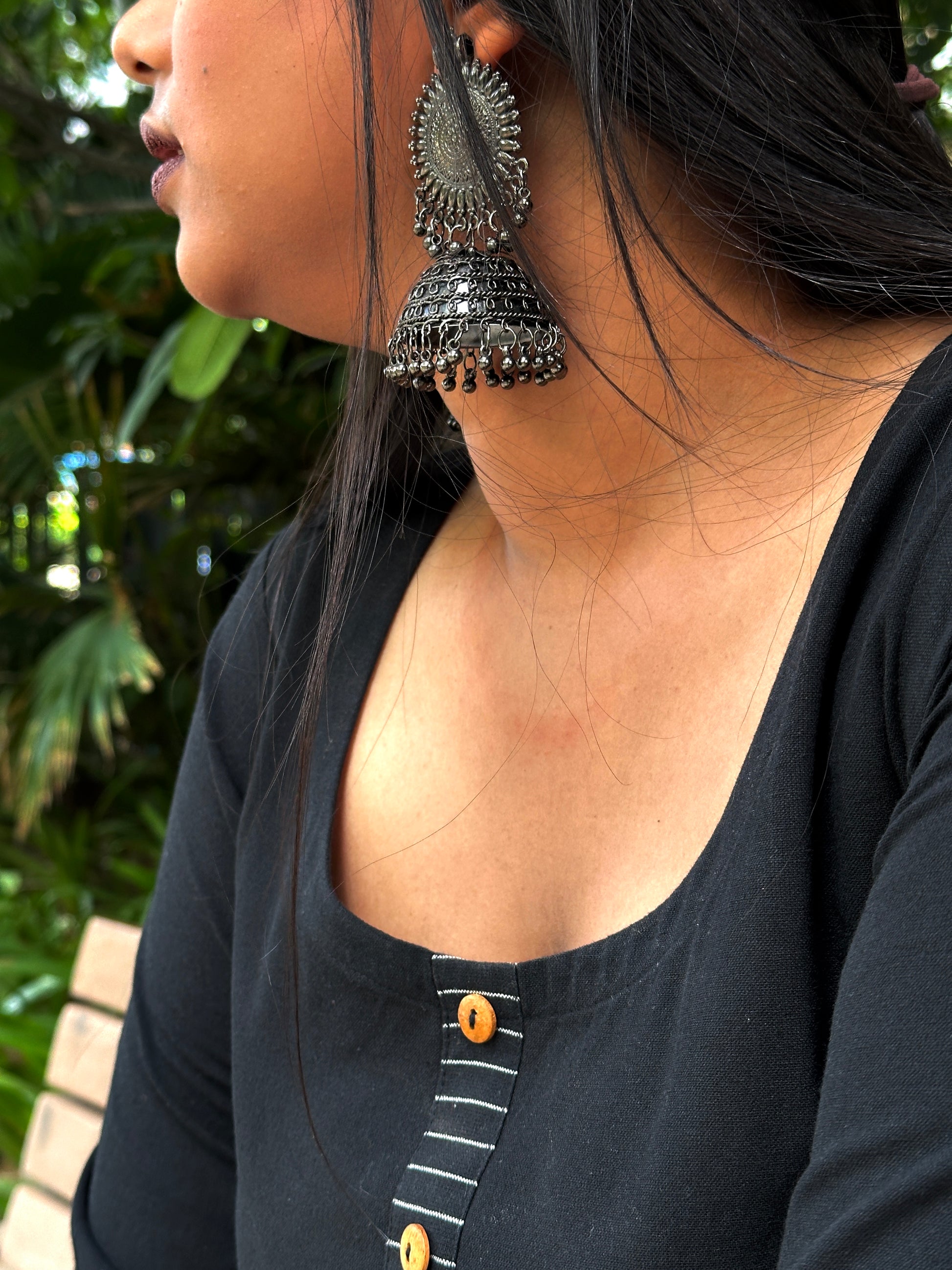 - The round neck is complimented with contrast detailing and panel work on the sleeves, finished with wooden buttons