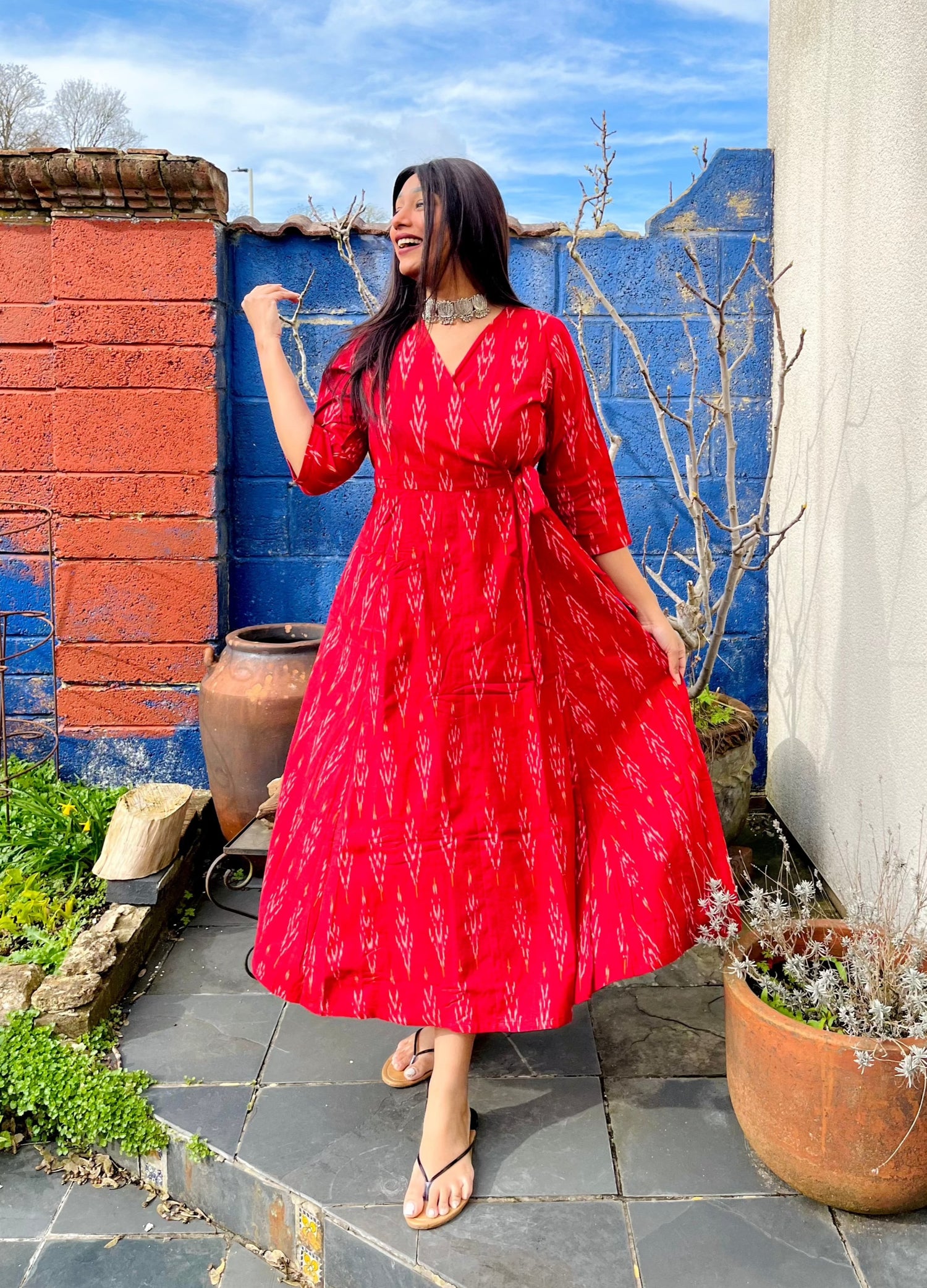 A timeless favourite reimagined in handwoven pure Ikkat cotton, this wrap dress blends comfort with confident elegance.