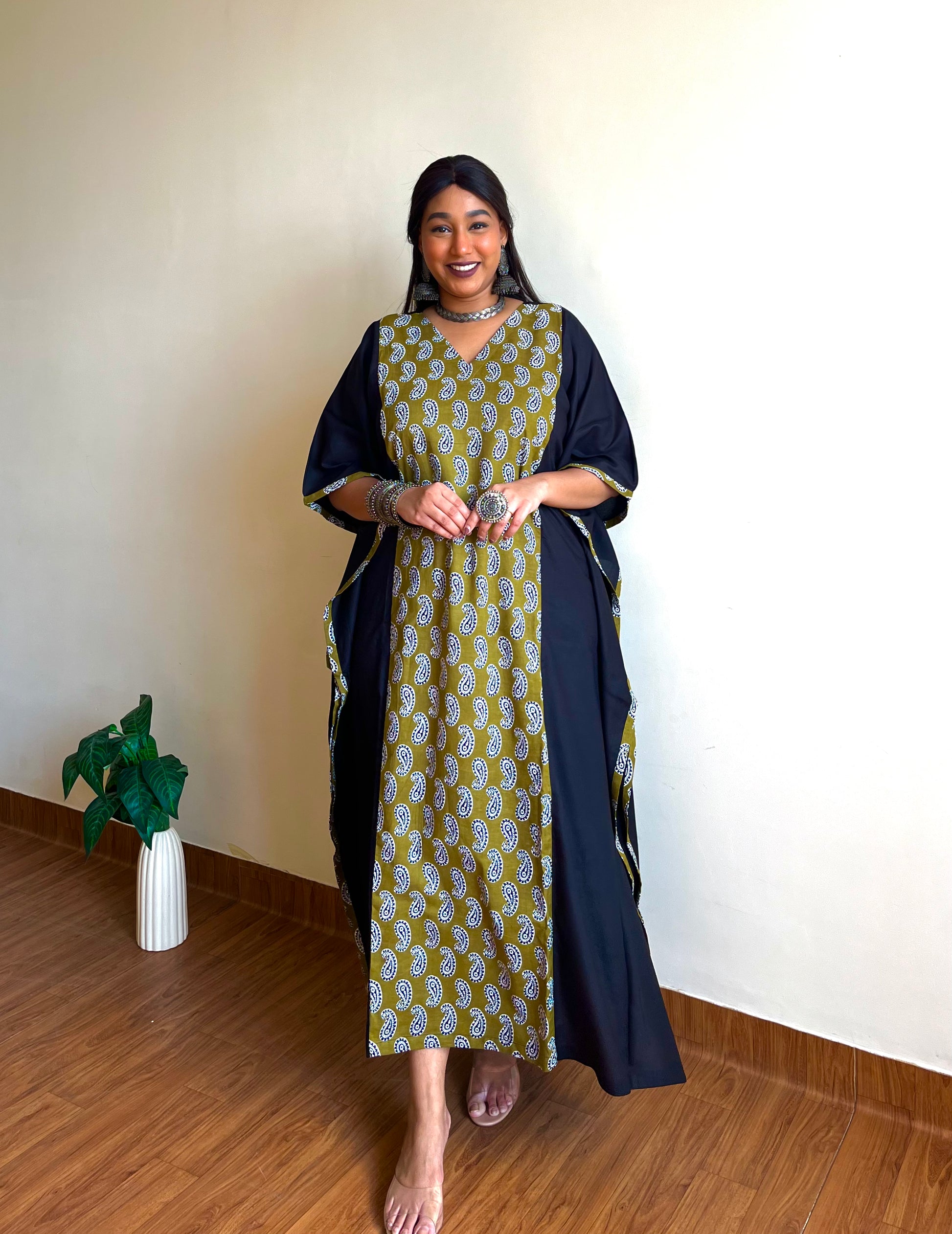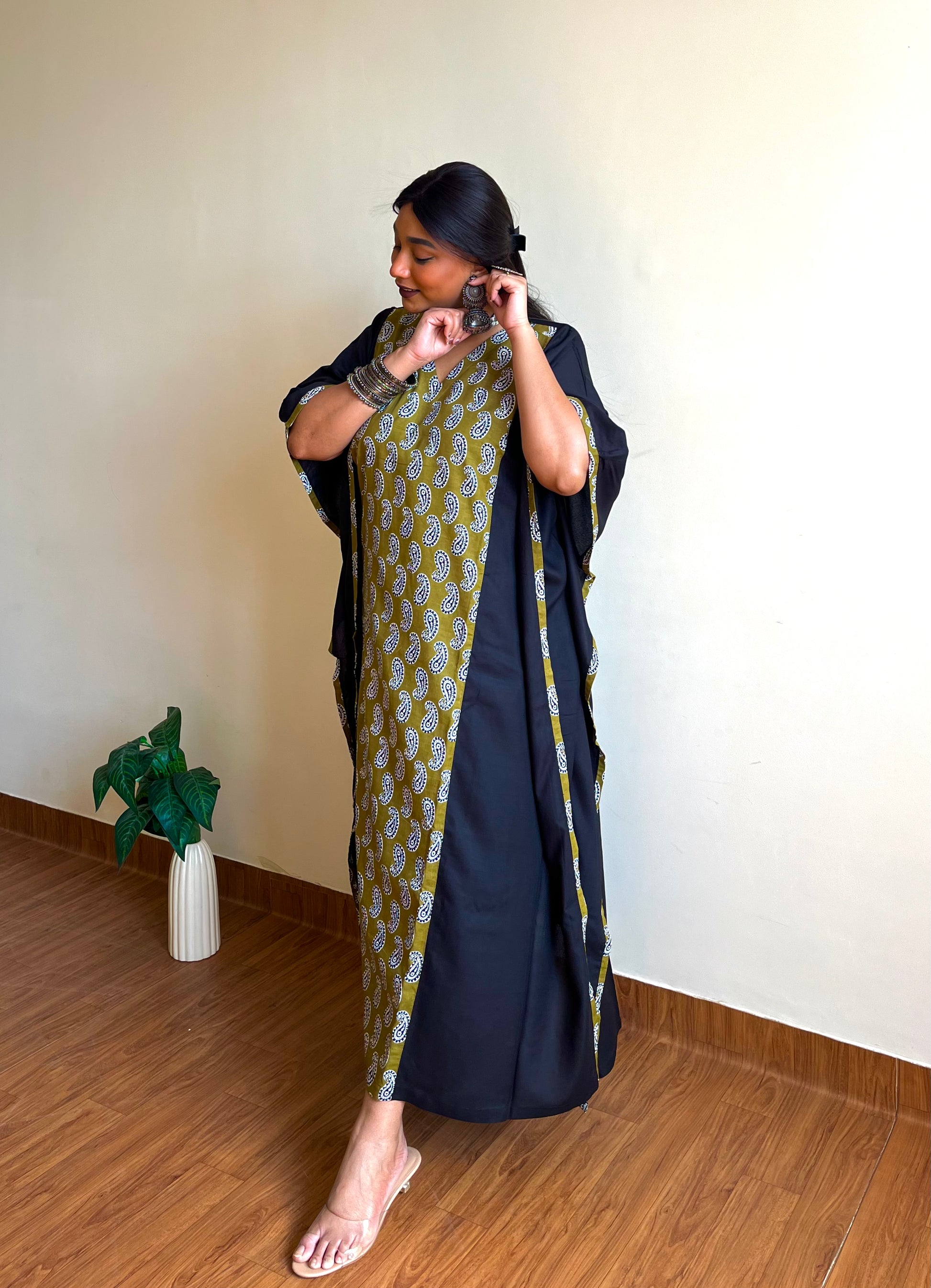 Olive Ikkat Panel Kaftan (S)