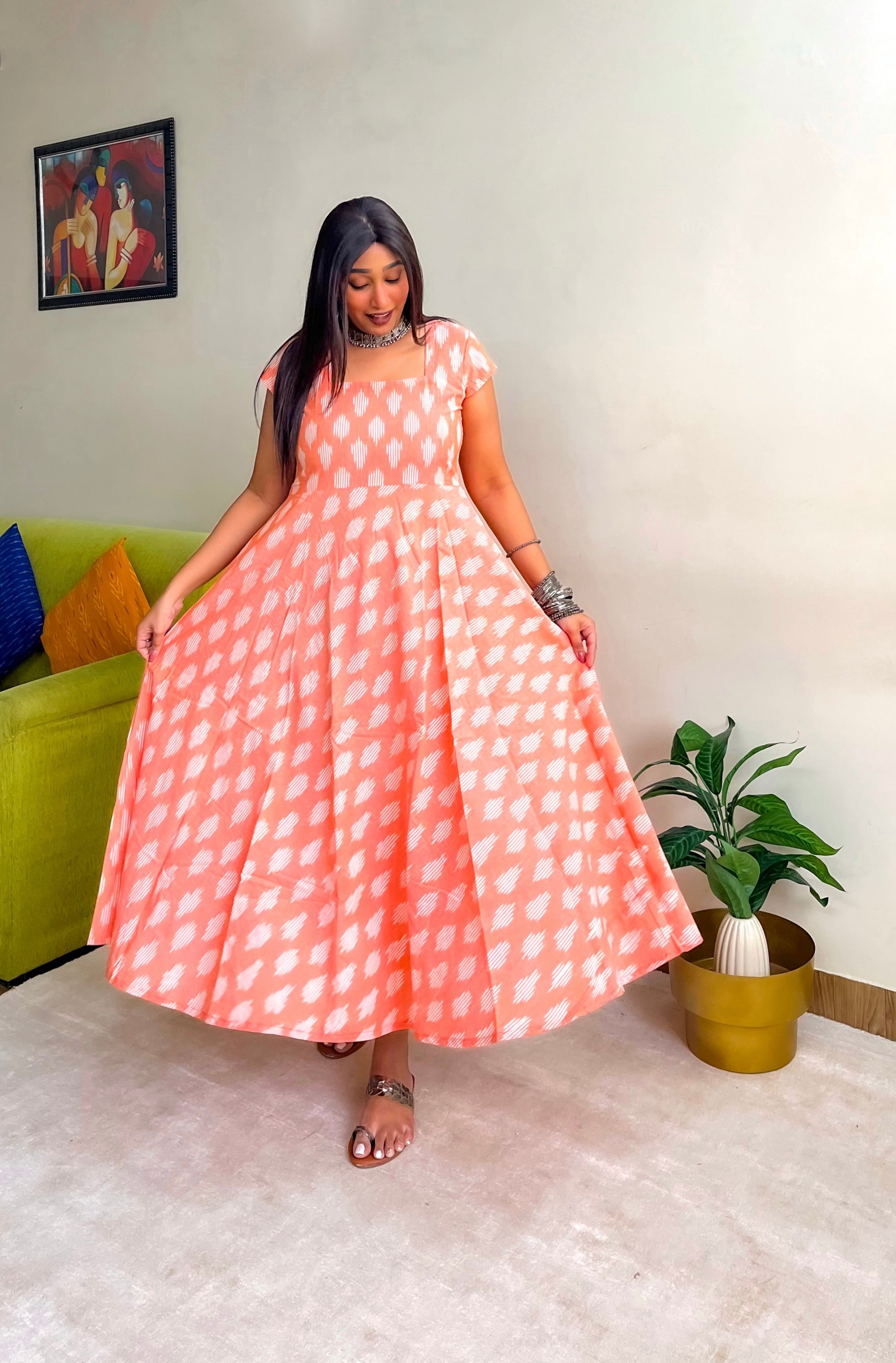 Peach Ikkat Flare Dress (S)