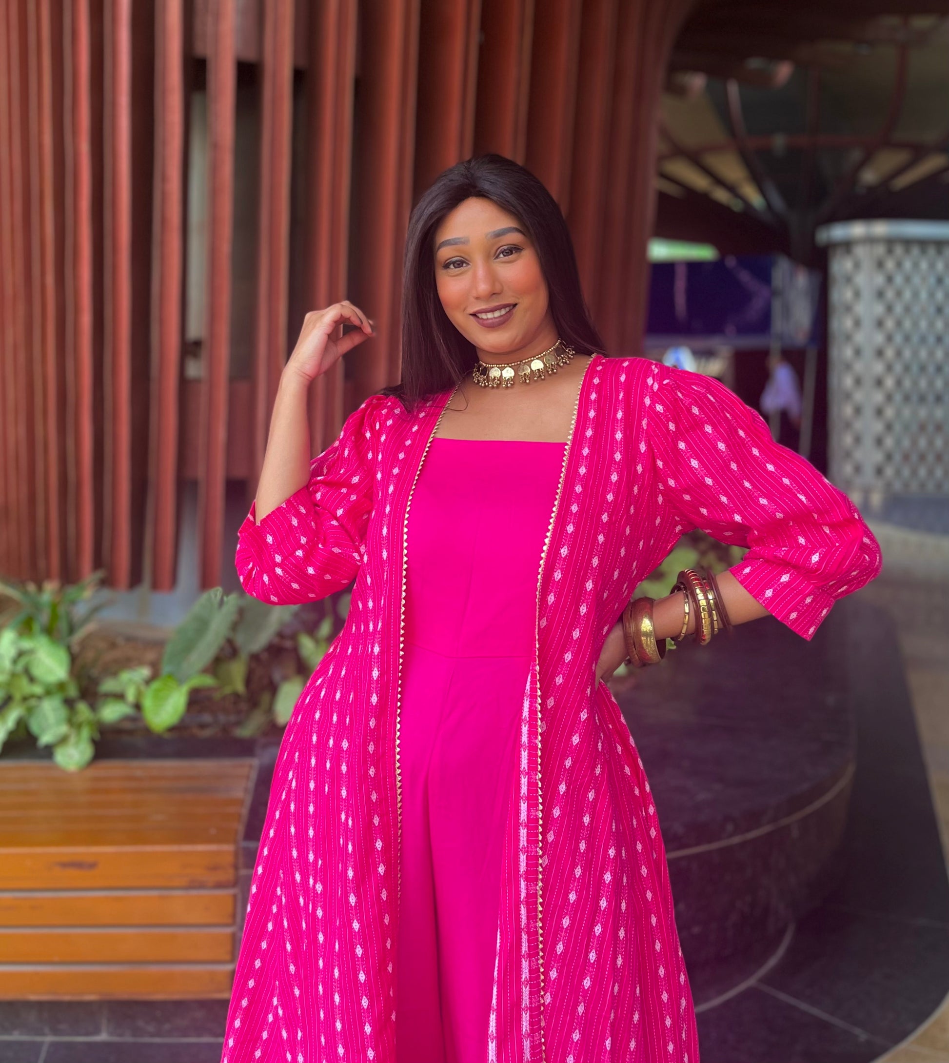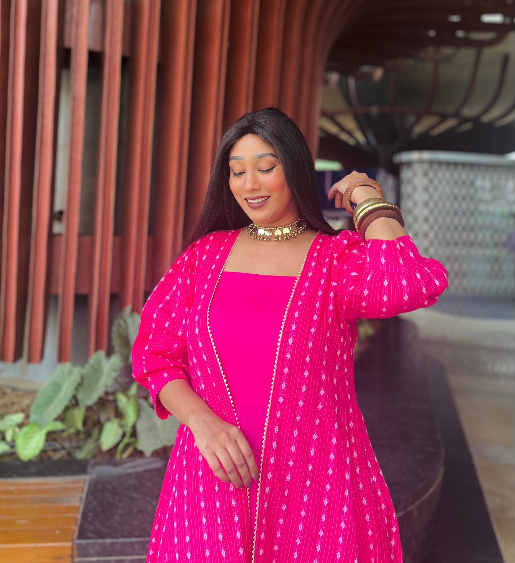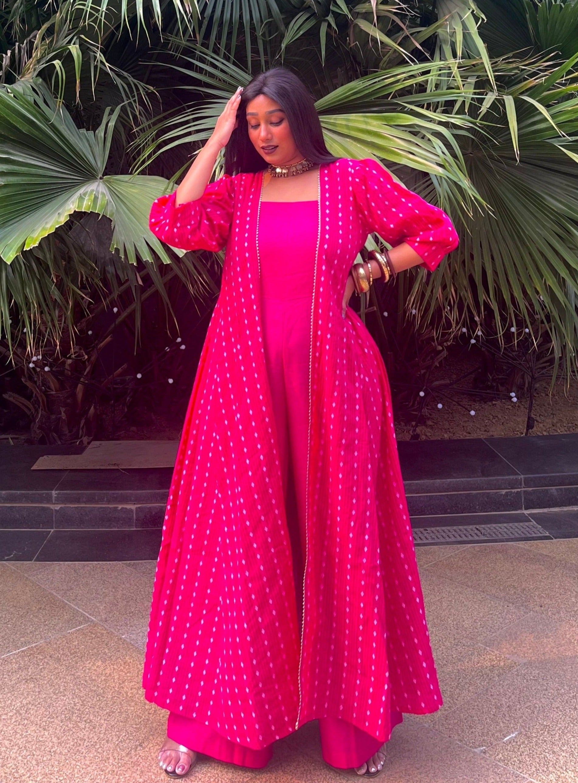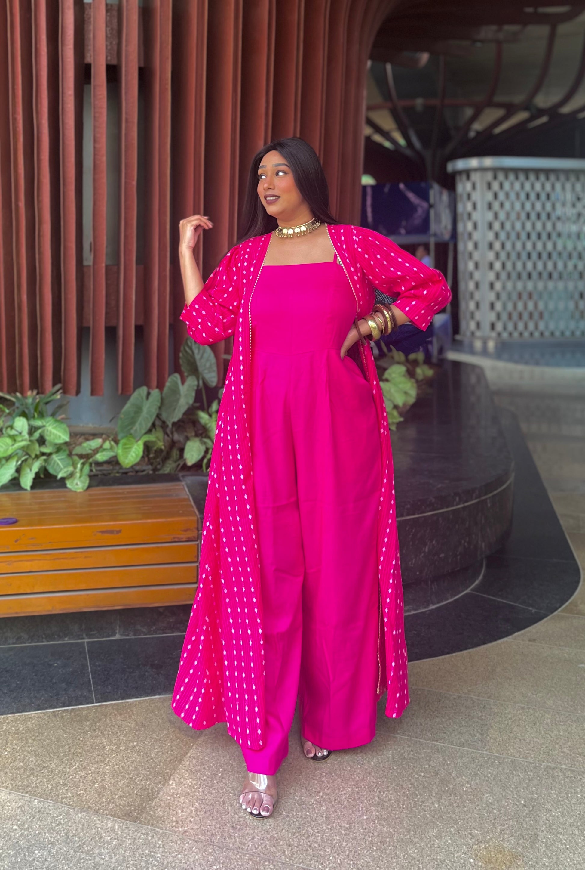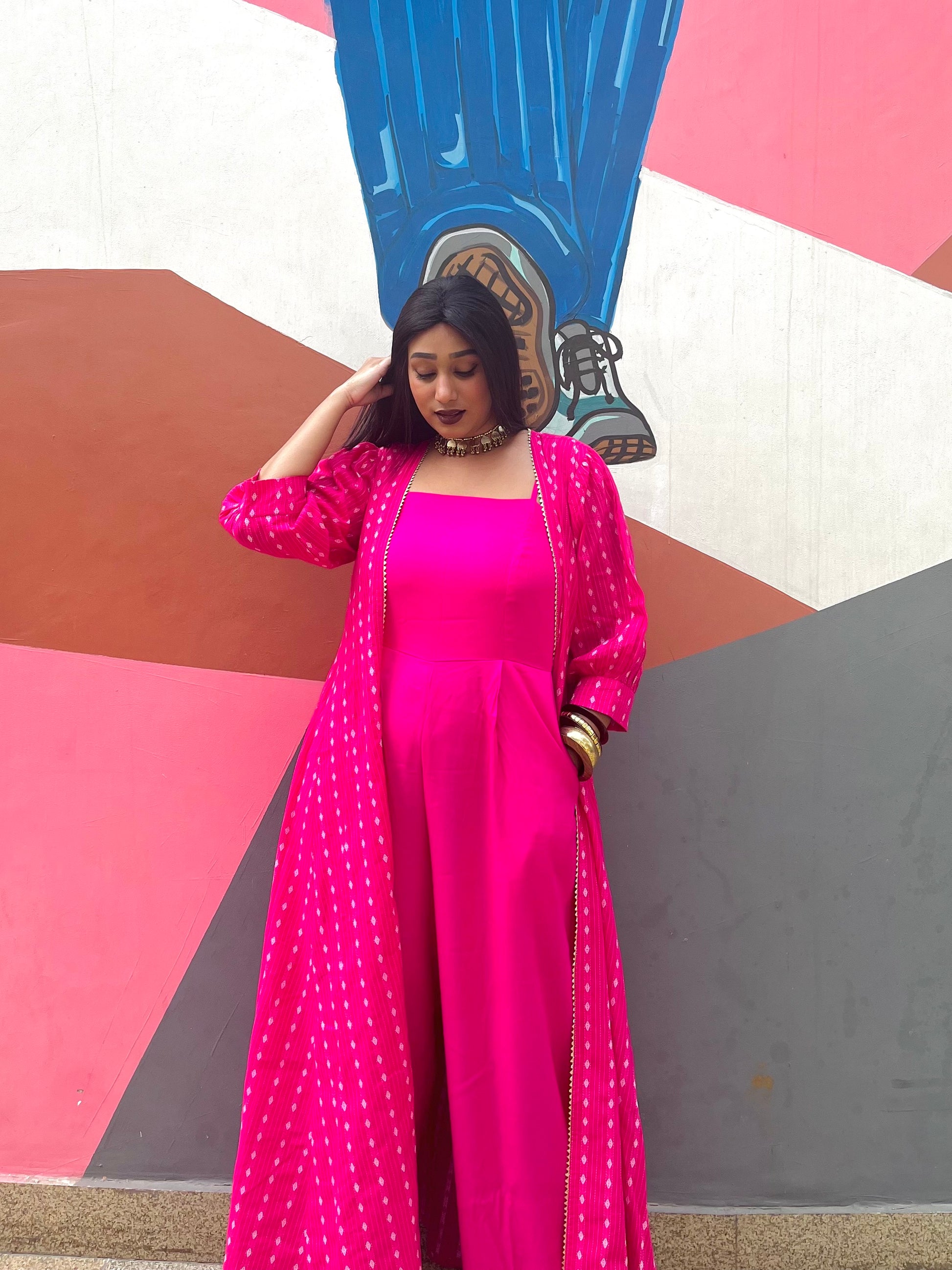 - All things bold, bright and luxe with our contemporary style jumspuit set that offers an ode to royal karigari. Designed in unison with a full-length hand embroidered kantha cape, meticulously curated to offer a truly opulent experience