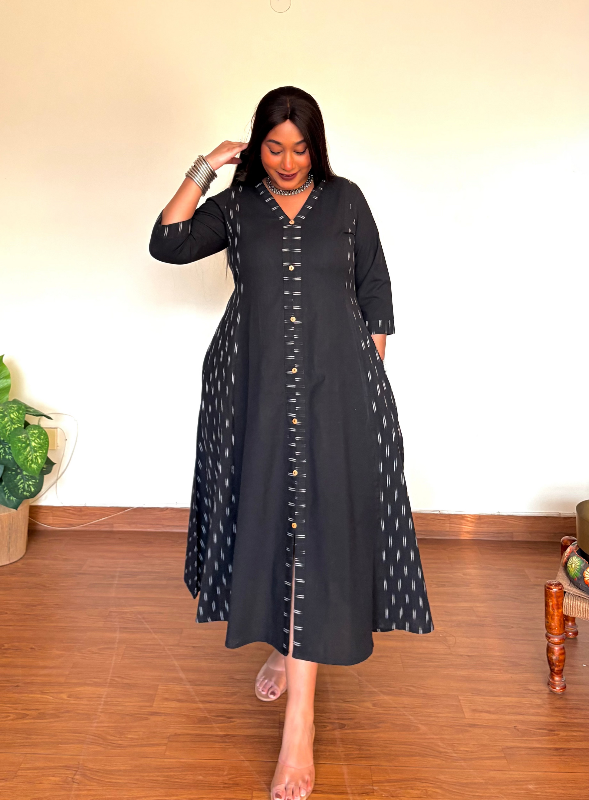 - Featuring an a-line patchwork ikkat shirt dress, handcrafted in a blend of earthy tones and modest detailing, for a professional yet stylish look