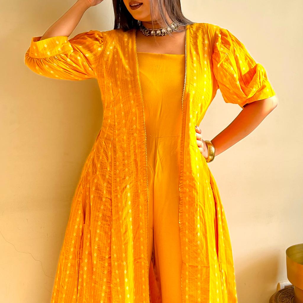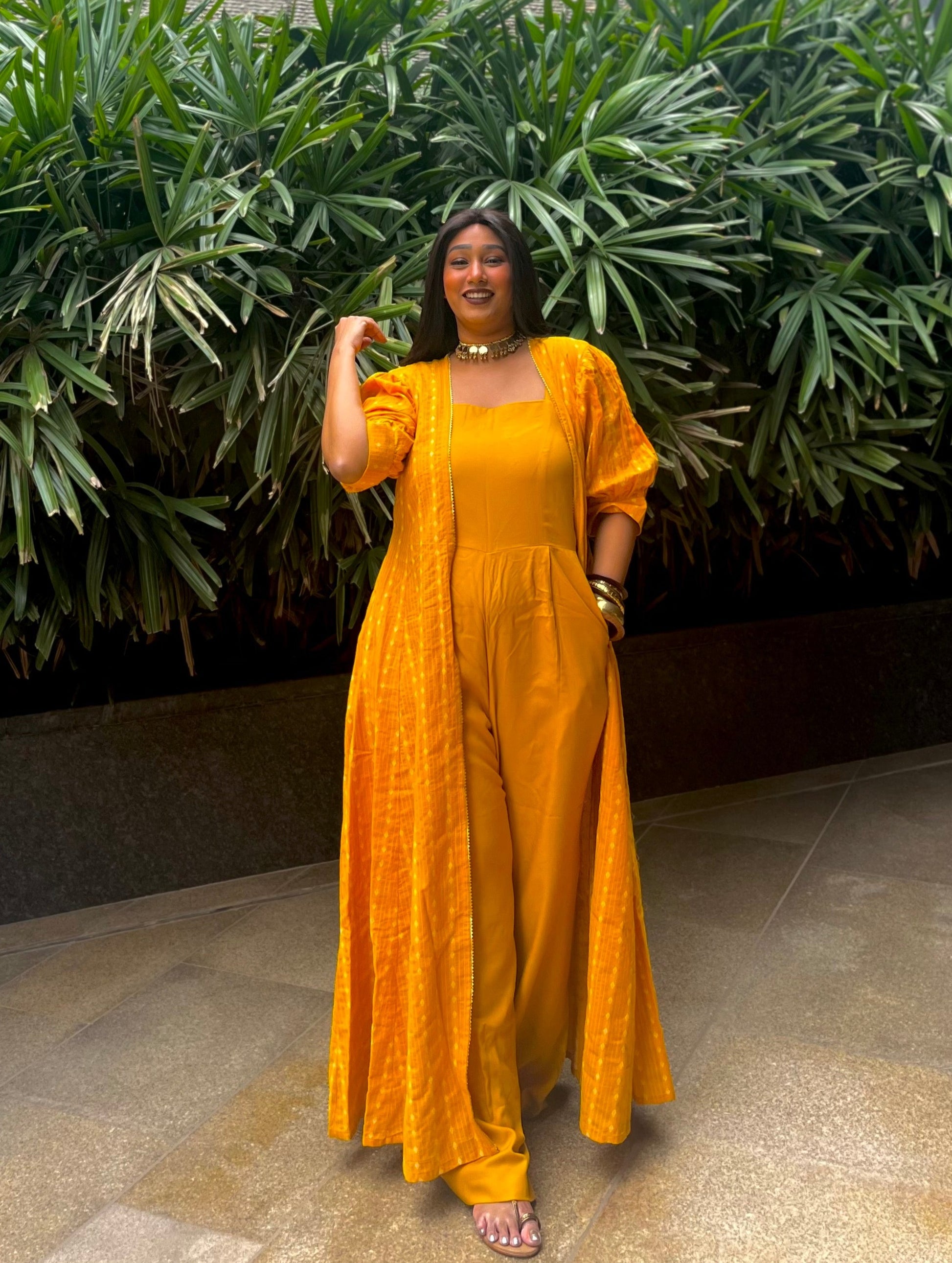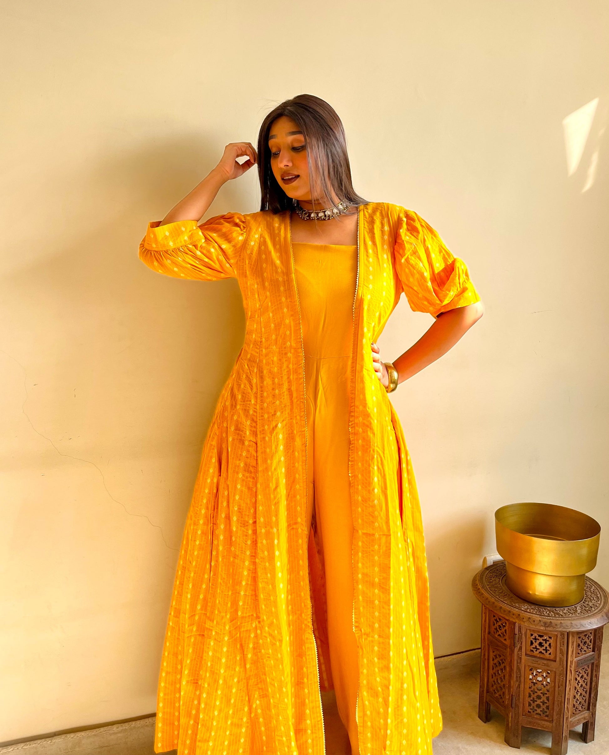 - This 2-piece set includes the full-length jumpsuit and cape, embellished with gold zari.
