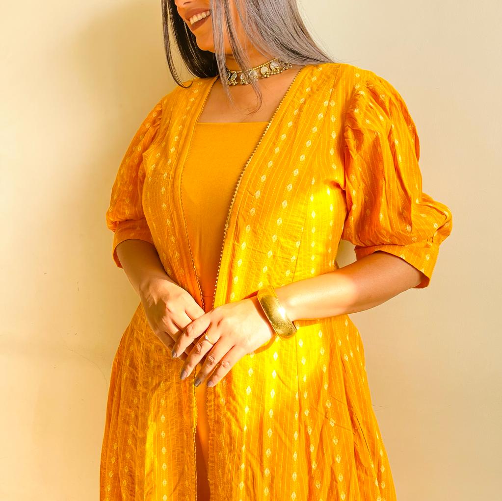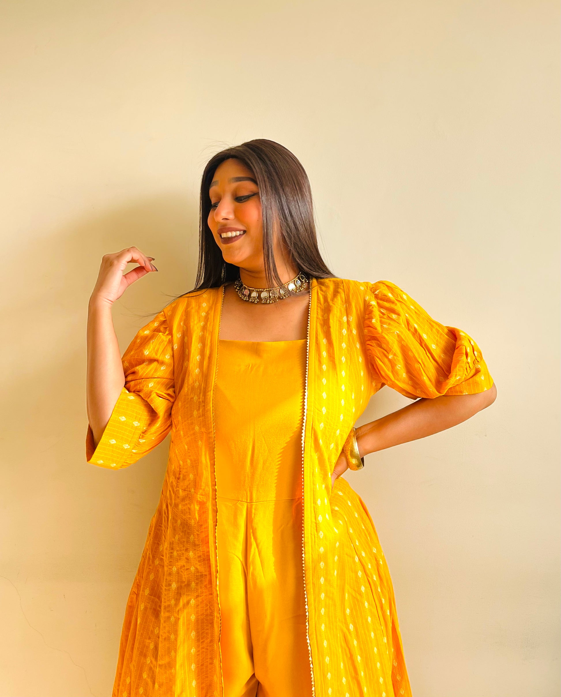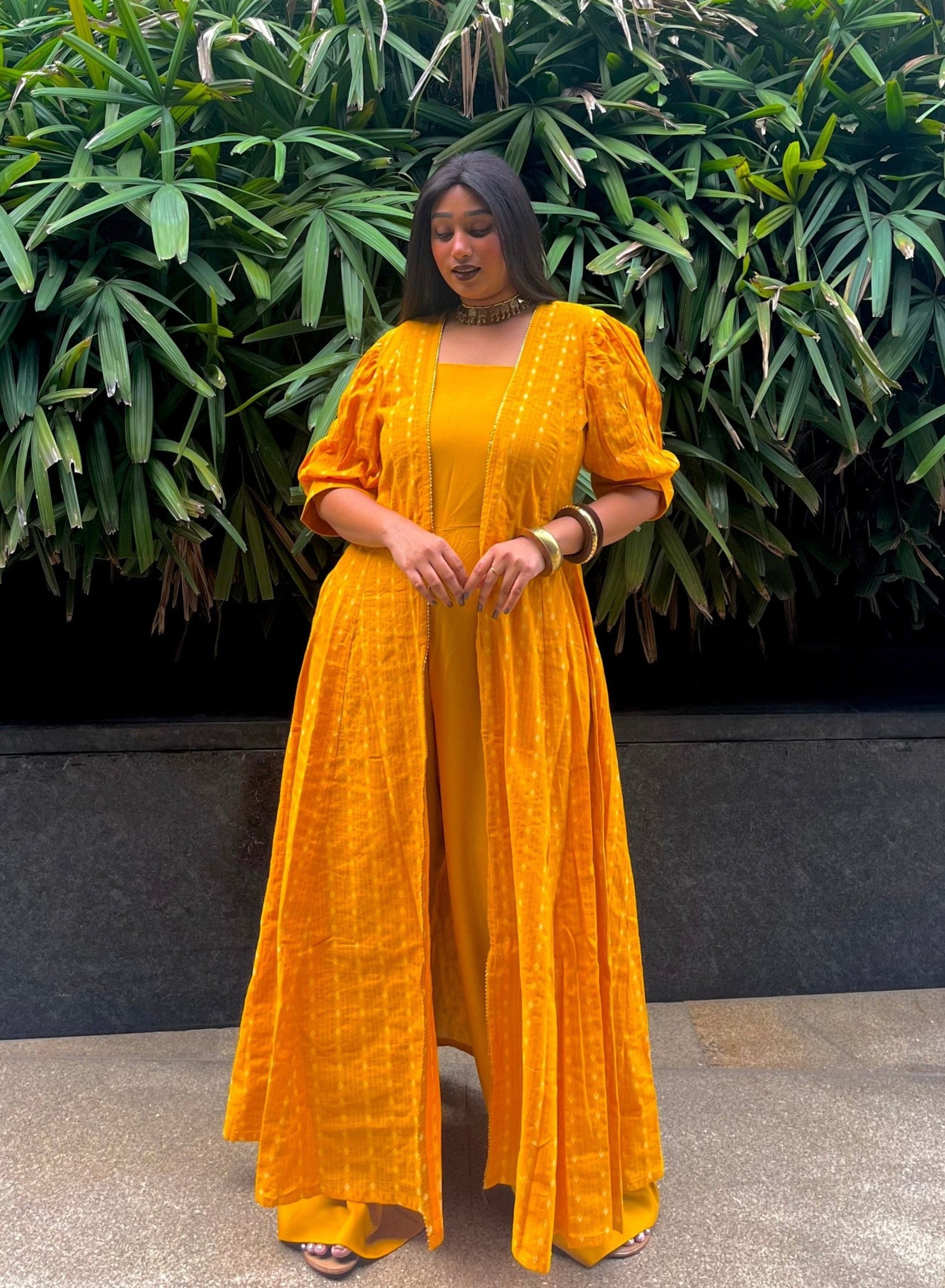 - This 2-piece set includes the full-length jumpsuit and cape, embellished with gold zari.